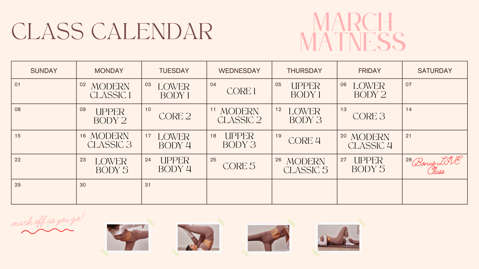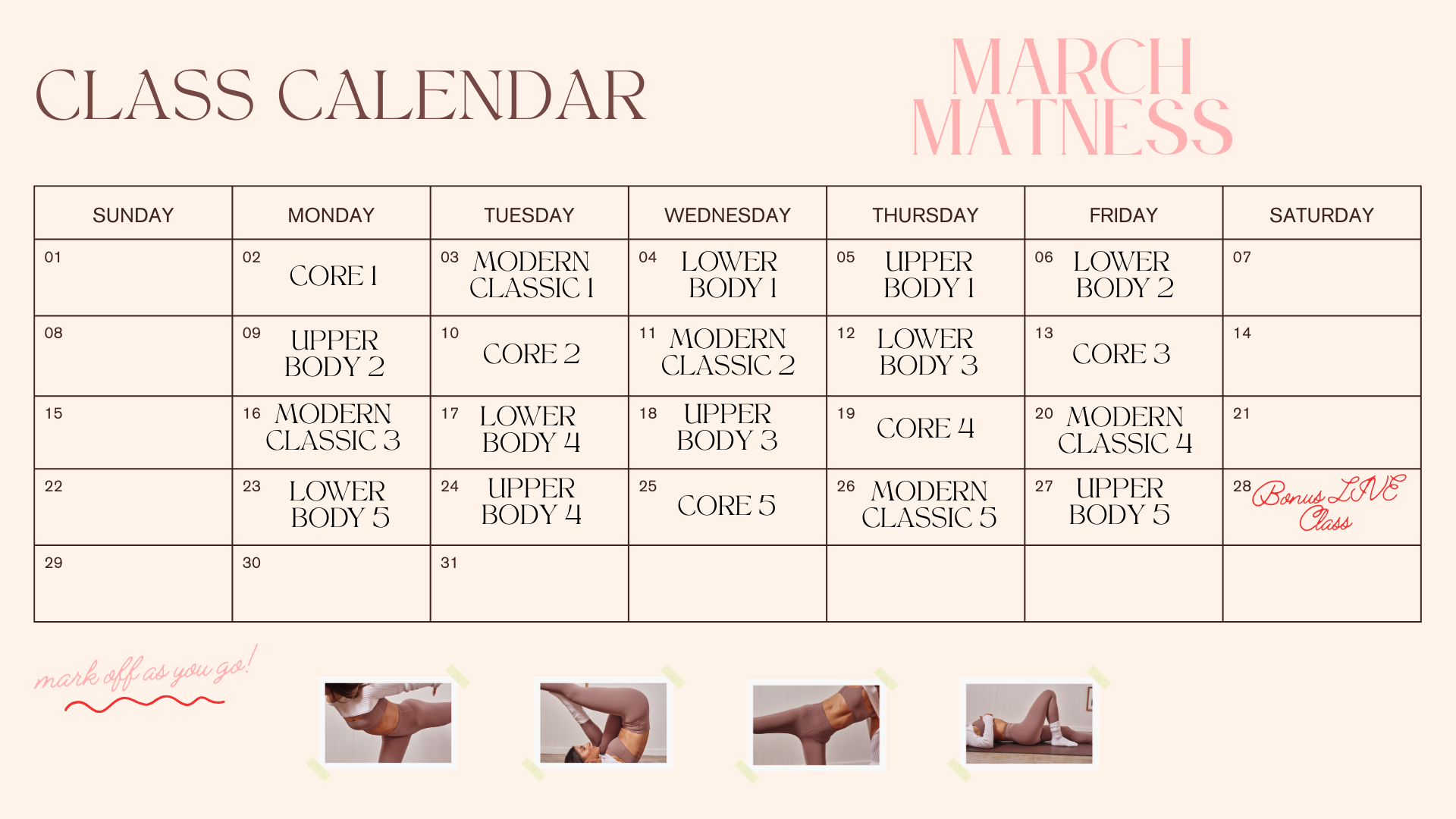 Each class has a distinct focus, covering four major categories over the 20 classes: lower body, upper body, modern classic and core.